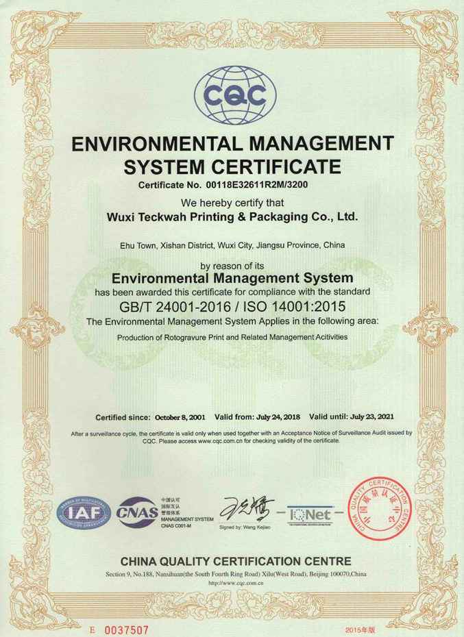 环境管理体系认证证书